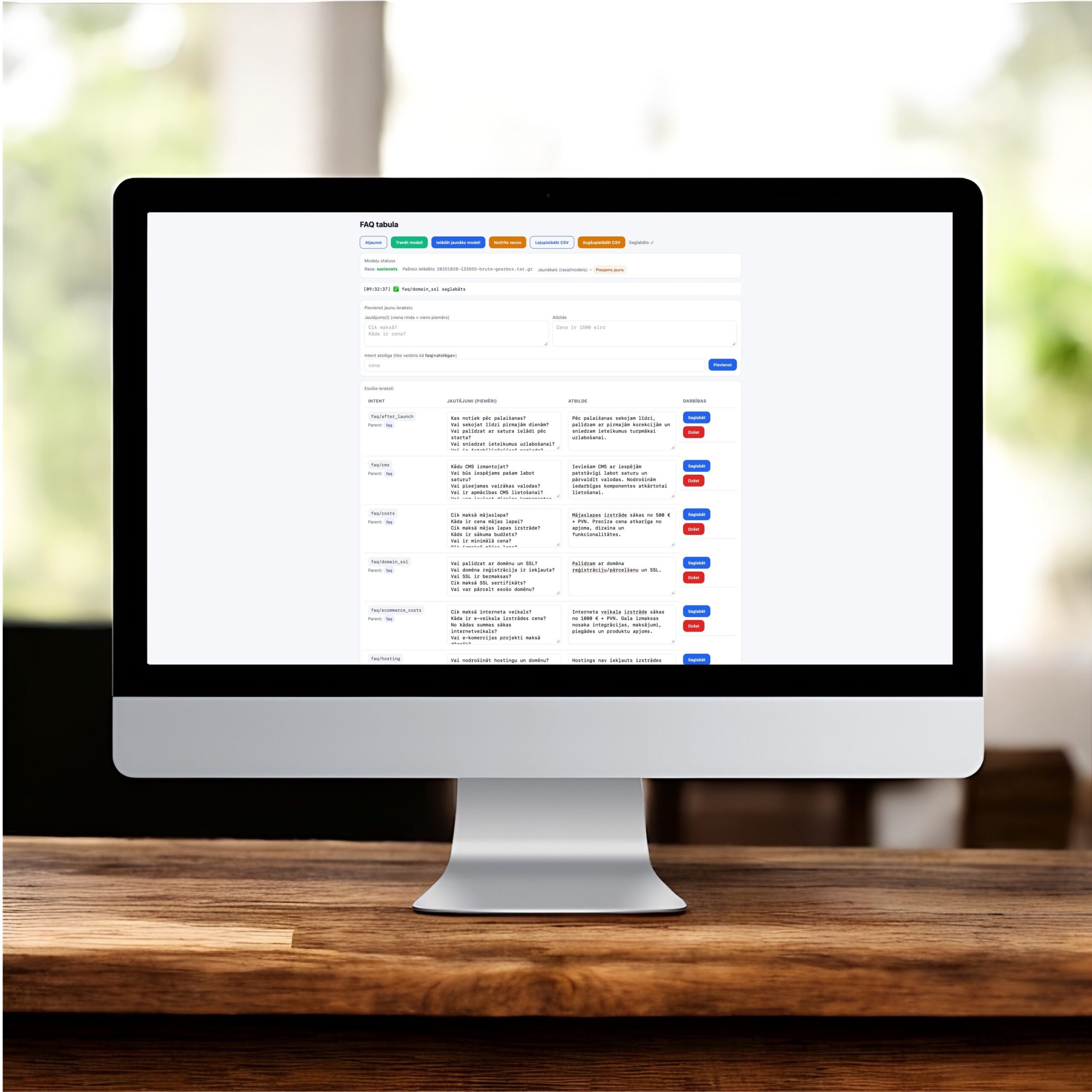 Teil on võimalik lisada, parandada või kustutada vastuseid küsimustele oma juturobotis. See on väga lihtne, ei mingeid täiendavaid IT-teadmisi, lihtsalt salvestage ja salvestage. Samuti saate kõik alla laadida CSV-faili, et oleks lihtne sirvida, samuti lisada ja saata teistele.